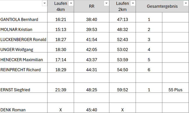 Mit sehr mäßiger Beteiligung fand am Samstag, 23.08, ein weiterer Bewerb des RLC, der Duathlon statt. Sieben beherzte Sportler ließen es sich nicht nehmen die Strecke 4/13/2km in Angriff zu nehmen. Klarer Sieger wurde Bernhard GANTIOLER. Er war zwar nicht der schnellste Läufer, aber dank seiner sehr starken Leistung am Rad ließ er dem zweitplatzierten Krisztian MOLNAR knapp hinter sich. Dahinter auf Platz drei konnte Ronald LUCKENBERGER seinen Verfolger Wolfgang UNGER um Haaresbreite kurz vorm Ziel schlagen. Mit ein wenig Abstand Maximilian HENECKER auf Platz 5, gefolgt von Richard REINPRECHT auf Platz 6. Als einziger 55+ Starter erreichte Siegfried ERNST auf Platz 7 das Ziel. Leider sagte der Läufer in der einzigen Staffel kurz vorm Start ab und so absolvierte Roman DENK außer Wertung nur die Radstrecke, dies jedoch mit einer soliden Leistung.